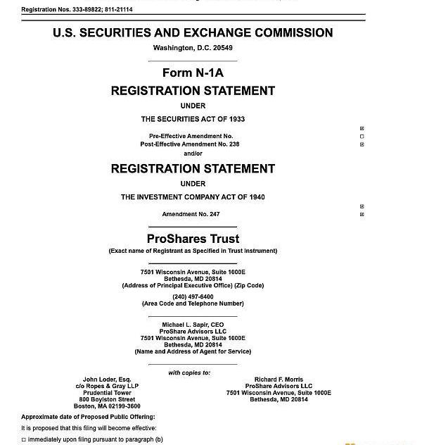 ProShares于10月15日向美國SEC提交了一份生效后的修訂招股說明書,預計將于10月18日公開發售。