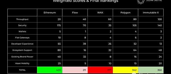 接下來,我們評估了安全性。這篇文章的很大一部分已經專門討論了這個主題,所以我們將保持簡短。ImmutableX所在的Starkware構建的第2層可以提供接近以太坊的安全保證,盡管這可能會有所不同,這就是它排名第二的原因。Polygon排在第三位,因為它有大約100個驗證器的未經許可的集合。Flow緊隨其后,盡管目前高度集中。正如我們之前提到的,隨著時間的推移,Flow可能會變得更加去中心化,我們個人認為,與WAX所依賴的21個驗證者組成的EOS卡特爾相比,DapperLabs團隊操縱的機會更少。