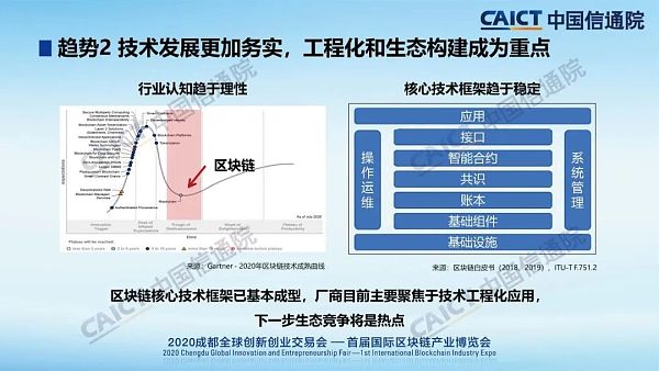 根據Gartner發布的2020年區塊鏈技術成熟度曲線顯示,區塊鏈行業認知整體趨于理性,同時其核心技術框架已基本成型。當前階段,行業目前主要聚焦于技術工程化應用,針對具體需求進行逐步優化。未來一段時間,區塊鏈行業技術發展將主要聚焦生態構建,產業競爭熱點將向生態競爭轉變。