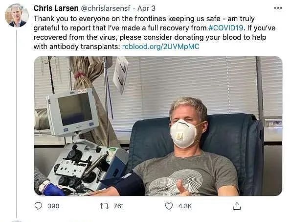 XRP/HKD-0.44%剛滿 60 歲、剛剛從新冠病中康復的 Chris Larsen,他曬出了一張自己獻血的照片,并借此呼吁那些感染了新冠病并且已經治愈的人們可以“考慮捐血來幫助進行抗體移植”。