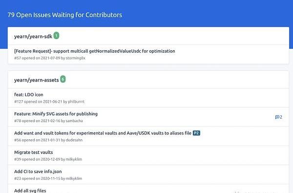 Yearn有一個儀表板,可以匯總其代碼存儲庫中的未解決問題,還有一個Telegram小組,專門為感興趣的參與者呈現任務。