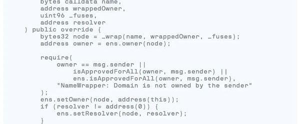 下面就是這個wrap函數,它相當簡單。首先,我們調用_wrap,它執行一些邏輯并返回哈希域名。然后,我們確保交易發送方確實是ENS域名的所有者,然后再接管該域名。請注意,如果發送方不擁有底層的ENS域名,則整個交易應還原,撤銷在_wrap中所做的任何更改。