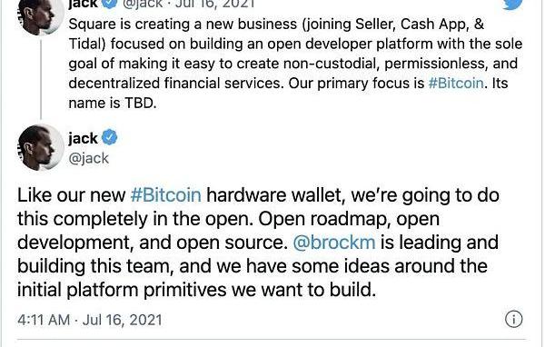 2021年7月16日,JackDorsey連發5條推特扔出重磅炸彈:“Square將成立專注于比特幣的新業務部門——“TBD”,以推動比特幣DeFi服務。