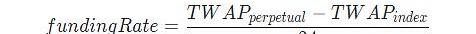 FundingRate計算方法是,將標記價格的每小時TWAP減去指數價格的每小時TWAP,再除以24: