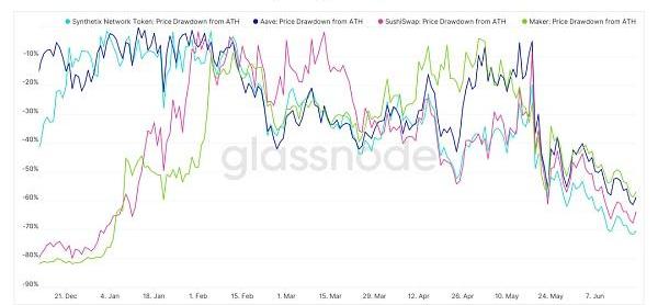 由于參與者在橫盤期間大部分都處于空閑狀態,因此過去指數級增長的活動現在停滯不前。我們可以在價格波動期間看到短暫的活動爆發,但是隨著價格的穩定,它會迅速放緩。大多數主流治理Token的價格下跌繼續加深。
