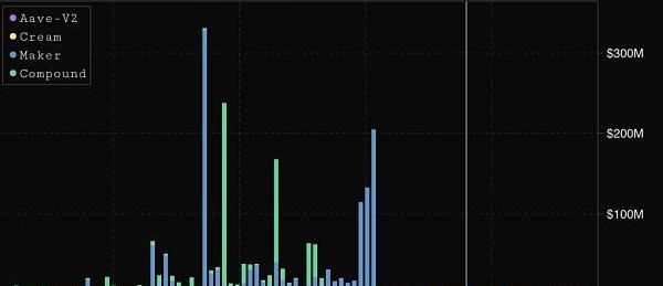 隨著我們進入進一步的波動,看看大型借款人的清算水平在哪里是很有趣的一件事。其中許多是自動頭寸,當健康因素達到危險水平時就會關閉。隨著價格達到清算水平,借款人的菜單上會出現額外的抵押品、平倉或容忍清算。例如,下圖是ETH貸款人清算水平的視圖,圖中按清算價格水平進行劃分;請注意1500美元的大型Maker頭寸和1000美元的大型Compound頭寸。