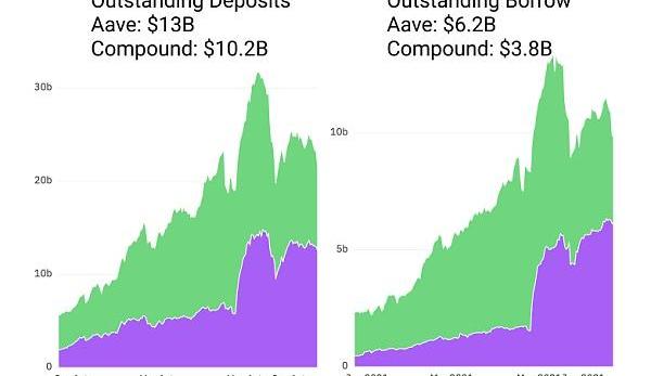 這些協議允許他們用存入的ETH借入穩定幣,然后用穩定幣來獲得有吸引力的風險規避收益或進行Token投機。持有者可以積累治理Token,增加他們的穩定幣余額,或大舉買入,同時保持他們作為長期貸款人對ETH的敞口。Aave和Compound的存款和借款仍然強勁。