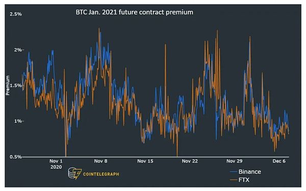 上圖顯示,這個指標在12月1日短暫觸及2%,但隨后由于比特幣未能突破20000美元的阻力位,而調整至0.9%。盡管下跌,但溢價仍保持在最低門檻0.5%之上,這表明專業交易員對此表示樂觀。