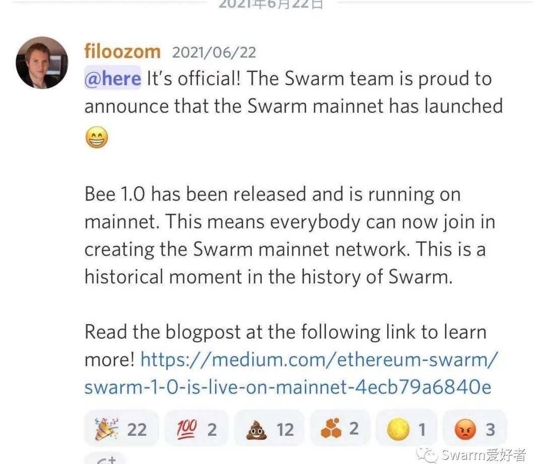 事實上,在6月22日,Swarm項目人員就在Discord的公告頻道中宣布,Swarm的主網已經上線,Bee1.0版本已經在主網上發布并運行,任何人都可以加入到Swarm網絡中。