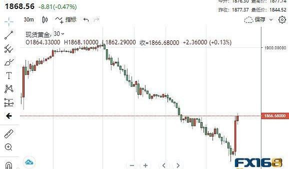 現貨黃金價格一度下跌約1.5%,創下5月17日以來的最低水平1844.52美元/盎司,但隨后很快自低位反彈近24美元至1868.56美元/盎司。