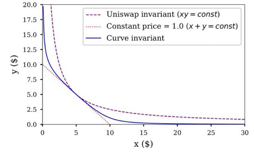 低曲率是要進行權衡的,如果CFMM的曲率為零,則CFMM的報價不會發生變化,而無論交易量是多少。因此,恒定和曲線(如mStable)為CFMM可持有的每個穩定幣設置了界限,以防止LP完全持有表現最差的資產。