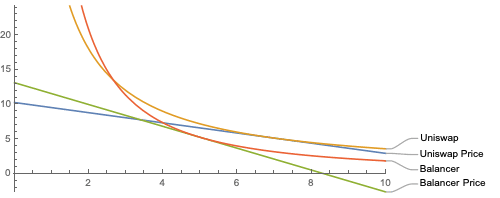 要了解這一點,請考慮下面的示例。我們有一個60:40的Balancer 池以及一個Uniswap池。對于同樣價值的儲備資金,Uniswap池的的曲率會略低。為了強調差異,我們就假設Uniswap池稍大一些。在下圖中,Balancer和Uniswap上的報價從不同的點開始(它們的切線斜率不同)。套利者在一個市場買入,在另一個市場賣出,直到兩條切線的斜率相等。請注意,Balancer的價格變化要比Uniswap池子的價格變化更大,但差別并不是很大。這是因為這兩個市場的曲率實際上相當接近,盡管Uniswap市場的儲備更高,權重也稍為均衡。