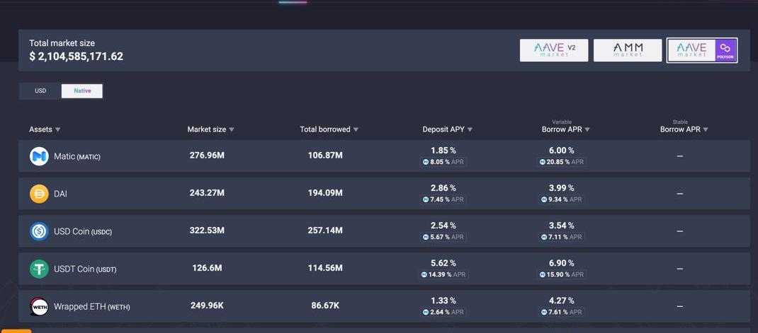 Aave的Polygon市場目前支持七種資產的存款:USDT、USDC、DAI、wBTC、wETH、MATIC和AAVE,以及除后者之外的所有貸款。雖然與以太坊市場相比,板塊有限,而且目前不支持staking或抵押品互換,但用戶仍然可以對DeFi中一些流動性最強的資產進行借貸,以獲得農場收益、杠桿做多或做空資產。