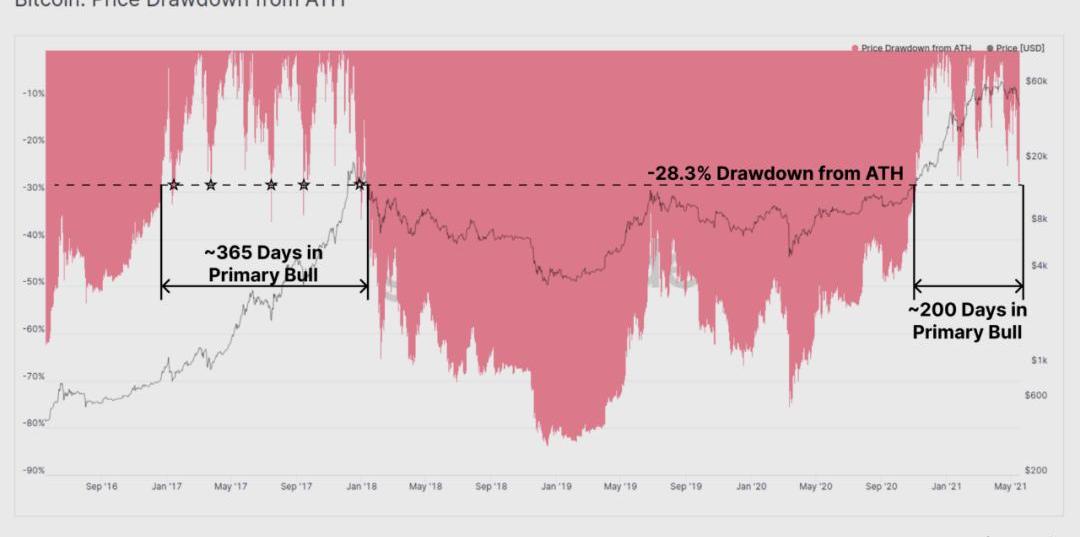 首先,我們將評估與2017年和2021年的牛市相比,這次修正的規模。目前的修正比4月13日的63.6千美元的ATH低28%。這是目前牛市中最深的一次修正,然而與2017年牛市中的五次主要回撤相一致。