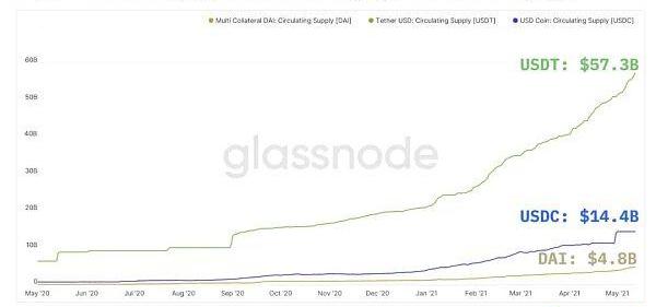 盡管DAI的鎖定百分比很高,但由于USDC和USDT的流動供應較大,因此后兩者在以太坊智能合約中仍占據主導地位。