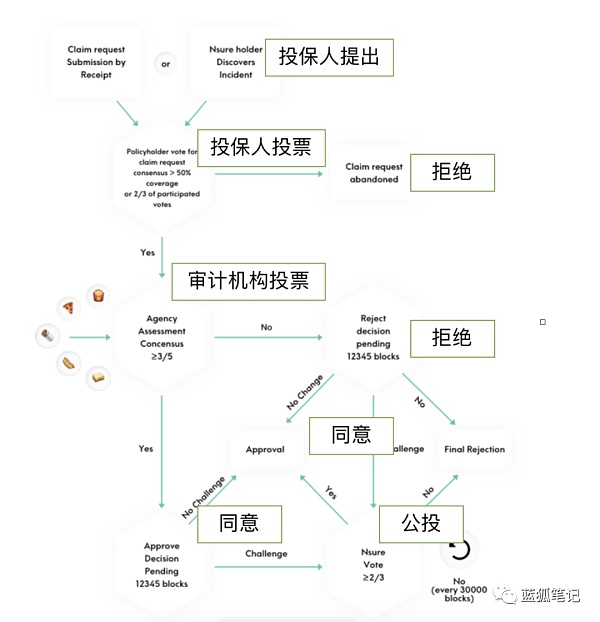 Nsure采用了三階段索賠的流程,它首先會讓投保人參與進來,由受害者自己投票提出理賠;然后會引入專業審計機構,通過專業審計機構給各方呈現事情的來龍去脈;最后進行投票。大概流程如下: