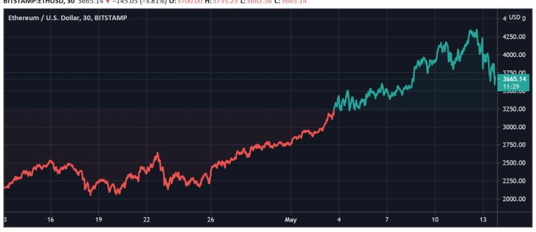 以太坊在四月份經歷了連續七個月的連勝。截至4月底,ETH的歷史最高價已達到2800美元,是加密市場第二成功的加密資產,其成交量增長了60%。