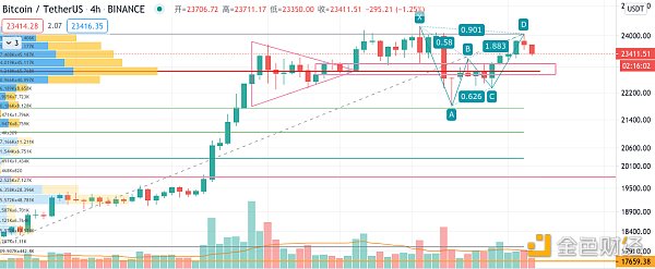 比特幣跌到21800美金后,得到下方買單支持,幾番震蕩又強勢反彈到了24000美金位置,持倉量在底部驟減,目前又回到下跌前的水平,說明多空分歧在加劇,大幅波動行情會延續。自18000美金快速拉升到24000美金以來,成交量主要還是分布在22000-24000之間的位置,多空在這個區間不斷換手,由于下方上來的資金過大,多空都需要時間去處理這個位置的意見分歧,所以預計震蕩還會繼續,OBV和盤口的量能積累雖然已經破了前高,不過當前位置確實阻力過大,前期的推動主力追漲或平空單籌碼都在猶豫,短期還是在這個區間震蕩為主,操作可在區間高拋低吸。
