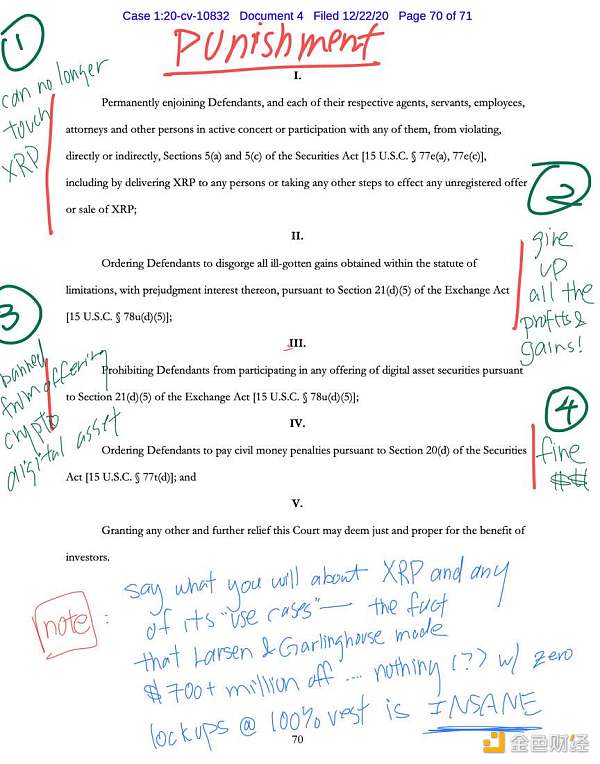 針對美國證券交易委員會起訴 Ripple 一事,Katherine Wu 又在一份 70 多頁的 SEC 起訴文件上畫出了重點,并且寫下了自己的筆記和看法:
