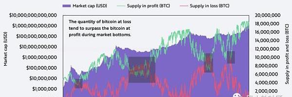 圖中綠線是盈利的幣量,紅線是虧損的,按歷史情況,牛市兩者相差越來越遠,兩者重合或虧損多過盈利也意味著熊市底部區域,這可能是通過鏈上數據很形象的表示了什么叫牛市所有人都賺錢,哈哈。