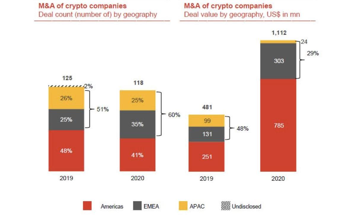 該報告指出,與加密貨幣相關的公司合并在2020年激增,創下交易活動的新紀錄。