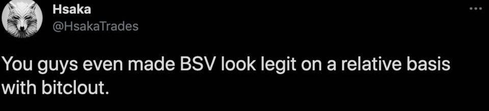 在推特用戶Hsaka看來,臭名昭著的BSV看起來都會比Bitclout靠譜一些。