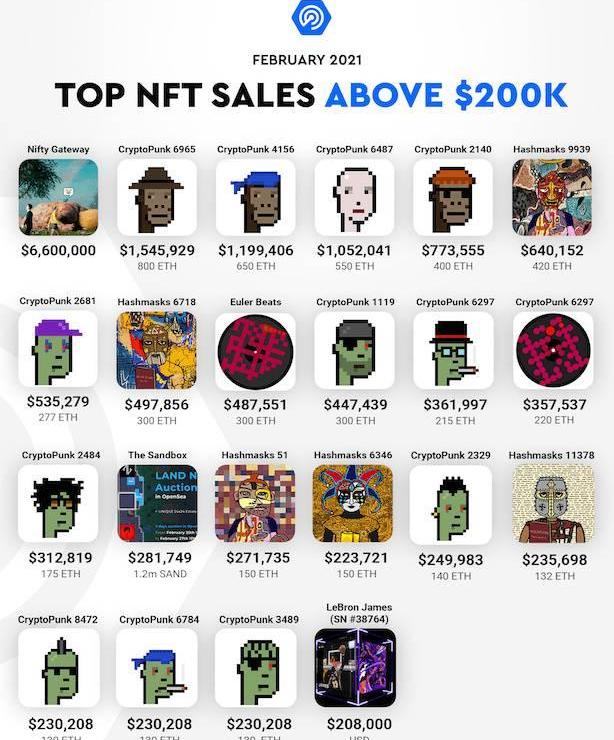 值得一提的是,NFT行業正在成為主流,其中領跑者是NBATopShots,CryptoPunks和HashmaskNFT在二月份的熱度也很高。另外,EulerBeats等后起之秀開始脫穎而出,同時由于Beeple的Crossroad在二手市場上以660萬美元的價格售出,藝術NFT開始引起人們關注。?