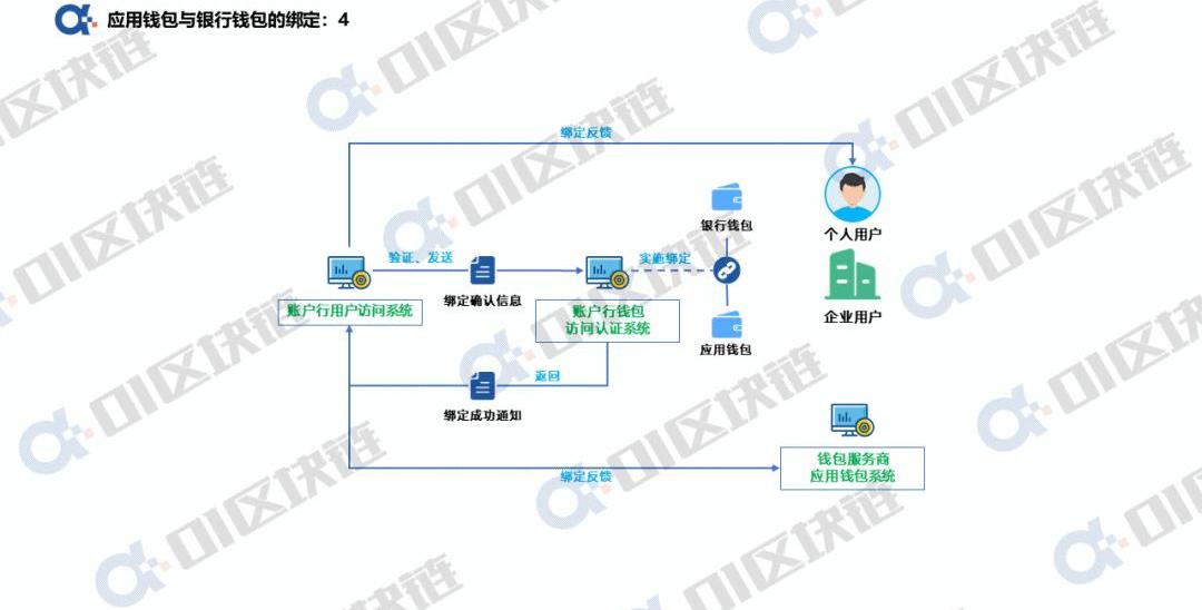用戶選擇銀行錢包,并與應用錢包進行綁定,將綁定確認信息發送至賬戶行用戶訪問系統,確認信息可包括用戶通過服務商應用錢包系統分配給用戶的用于訪問應用錢包的認證證書進行的簽名。賬戶行用戶訪問系統利用用戶的應用錢包認證證書對用戶發來的綁定確認信息的數字簽名進行驗證后,將用戶的確認綁定信息發送至賬戶行錢包訪問認證系統進行應用錢包認證證書與銀行錢包的綁定。并在獲得賬戶行錢包訪問認證系統發來的綁定成功通知后,反饋給用戶和服務商應用錢包系統。