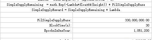截至2021年2月9日,每票獎勵20.9157枚FIL,其中有6.96968676057905枚FIL由簡單供應產生,13.9461132394209枚FIL由基線供應產生。通過以下公式可求出SimpleSupplyReward,然后SimpleSupplyReward/ExpectedWinCountPerEpoch即可求出該高度的每票簡單供應部分。