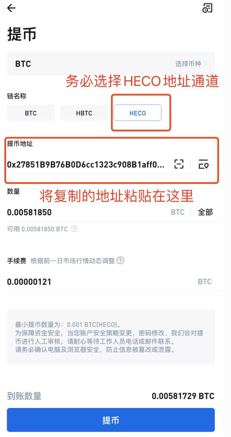 重要的事情說三遍:務必選擇HECO地址通道,務必選擇HECO地址通道,務必選擇HECO地址通道。一旦提幣到其他地址通道,將無法找回。