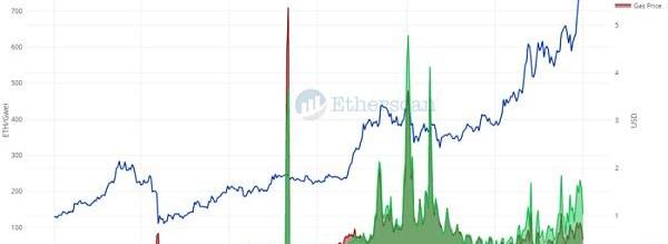 隨著流動性挖礦的熱度稍減,Gas價格開始在100Gwei左右徘徊。但如果是以美元計,考慮到ETH價格的上漲,轉賬費用仍在上升。2021年初,隨著ETH價格的扶搖直上,以美元計的轉賬費用再次創下了歷史新高。