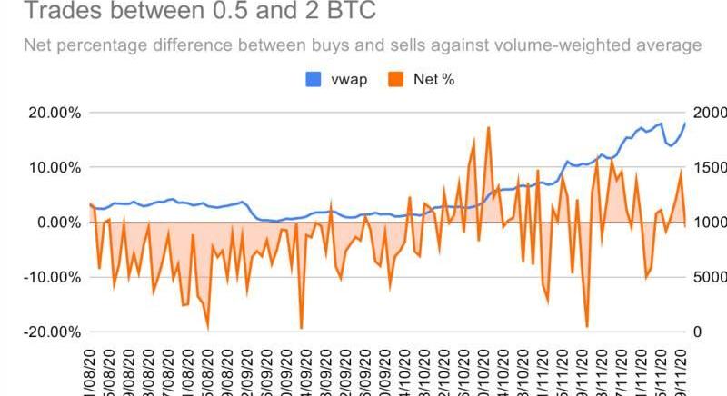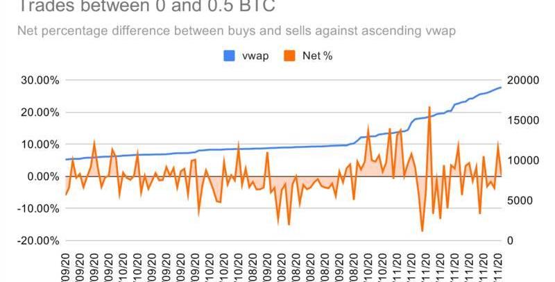 上面的凈百分比差異圖顯示了一個更清晰的趨勢,大部分購買發生在9月中旬到10月底之間,因為比特幣的交易價格在10000美元到11500美元之間。