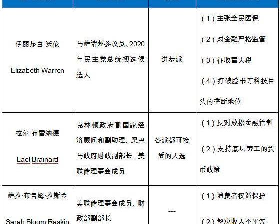 首先是進步派的伊麗莎白·沃倫,哈佛大學教授,馬薩諸州參議員,被稱為精英版桑德斯,2020年民主黨總統初選候選人,沃倫主張對金融行業采取更嚴格的監管措施、同時主張對富人征收巨額財富稅,提高企業稅率,在奧巴馬總統任內曾作為總統特別助理領導了美國消費者金融保護局的建立,但致力于維護底層人民利益,因此極力反對奧巴馬推出的跨太平洋伙伴協議。然而,即便對于民主黨而言,沃倫也太左了,民主黨內也很難接受,更何況共和黨,國會很難通過任命。