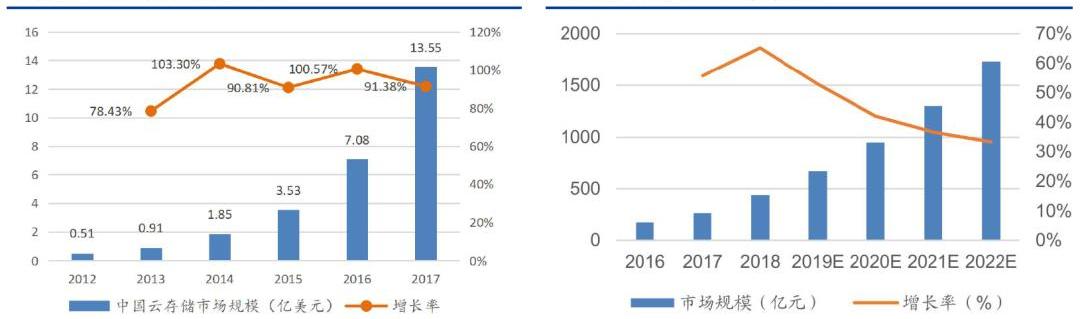 根據云存儲服務性質的不同,可以分為公有云、私有云和混合云。其中,公有云面向包括個人、家庭、企業在內的多種客戶;私有云由企業或組織使用及維護,用戶在個性化等方面有更多的控制權;混合云將公有云和私有云進行混合和匹配,達成相對高性價比解決方案。據IDC預測,2025年中國數據規模將達到48.6ZB,其中超過80%為非結構化數據,且由于發展滯后北美4-5年,中國云市場增速高于全球水平。2018年中國云計算整體市場規模達962.8億元,增速為39.2%。其中,公有云市場規模達到437億元,增速為65.2%,預計接下來三年內仍將快速增長。