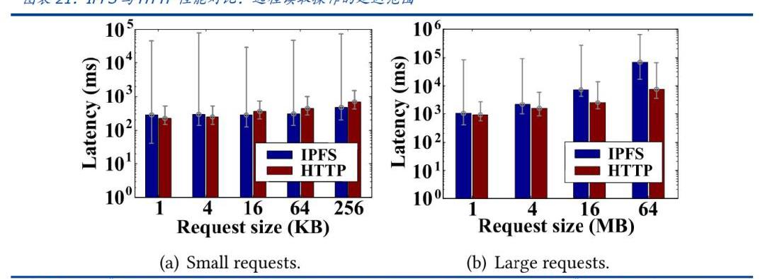 實驗測試顯示IPFS的I/O性能還有待進一步改善。由于采用分布式存儲,文件的讀取受到節點自身及全網其它節點的影響,主要包括:節點數量和穩定性、帶寬、網絡位置等。來自復旦大學的研究人員對IPFS的I/O性能做了一項實驗,并和HTTP進行對比,以驗證IPFS網絡處理請求時的延遲和吞吐量表現。遠程讀取操作的平均延遲方面,當請求是小的請求時,在1k-4k間,HTTP延遲比IPFS低。遇到16-256k之間的文件,IPFS的延遲狀況優于HTTP。當處理大文件請求時,IPFS在延遲上的表現不盡人意,尤其是請求大小超過16MB時,IPFS的處理時間接近了20秒。超過64MB時,延遲更是可以達到70秒,是HTTP的7倍。當然,這是實驗室測試條件下的結果,在實際應用過程中,尚未有具有說服性的案例;無論如何,IPFS等分布式存儲方案若想替代HTTP等中心化方式,還有很多底層技術構架、協議和應用生態方面的改進與探索。