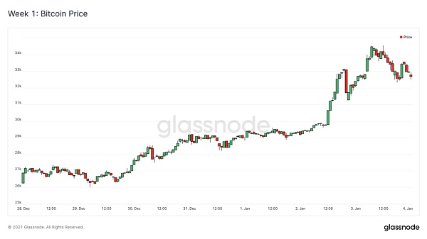 比特幣在新年期間又度過了令人印象深刻的一周,達到歷史新高,首次突破3萬美元。本周開盤價為26270美元,之后繼續上漲,達到34550美元的高點,之后略有回落,本周收于32685美元。