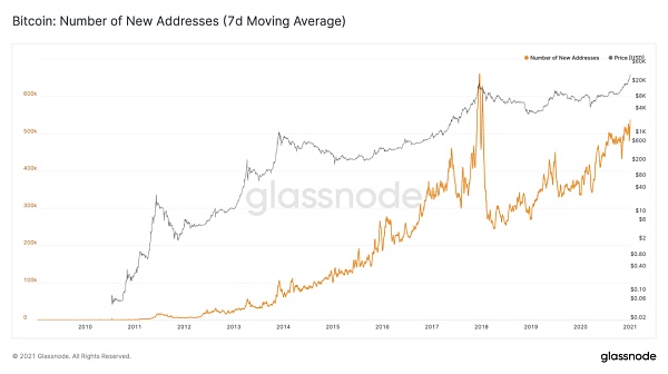 然而,盡管新聞報道和散戶對比特幣的興趣正在迅速增長,但每日新比特幣地址的數量仍未達到2017年的水平。該指標的穩定和持續增長(與上一輪大牛市中突然出現的峰值相反)表明,比特幣的應用正在經歷強勁的有機增長,但不是典型的泡沫病式增長。