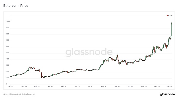 ETH在周日的牛市行情中,單日漲幅超過37%,突破1000美元大關,與去年同期相比上漲了近7500%,當時的價格低于140美元。