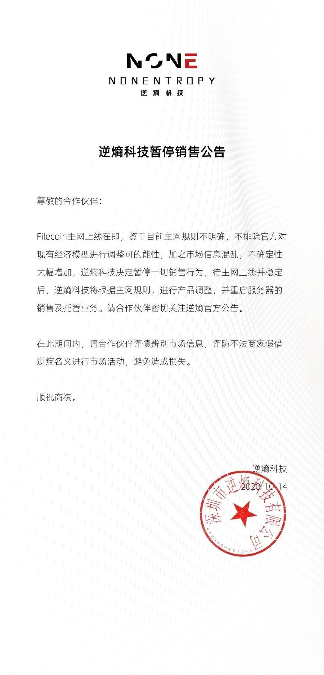 這次終于確定了。2020年9月28日,Filecoin官方發博文公告Filecoin主網將在太空測試epoch達到148888時正式開啟。截止目前,據Filfox瀏覽器數據,當前FIlecoin區塊高度為145530,不出意外的話,Filecoin將在10月15日晚上11點之前達到148888,隨之完成主網上線。然而就在Filecoin主網上線前一天,礦商公司逆熵科技發布了《逆熵科技暫停銷售公告》。
