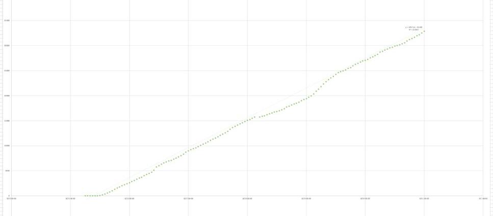 根據對數、對冪、多項式、線性回歸等回歸擬合綜合評估,線性回歸擬合程度最高推演公式為y=5957.3*T-792.93,雖然整個網絡單節點算力增長規律難尋,但根據此公式推導,當網絡正常運行到14天,頭部樣本礦工總算力可達81.4687P。