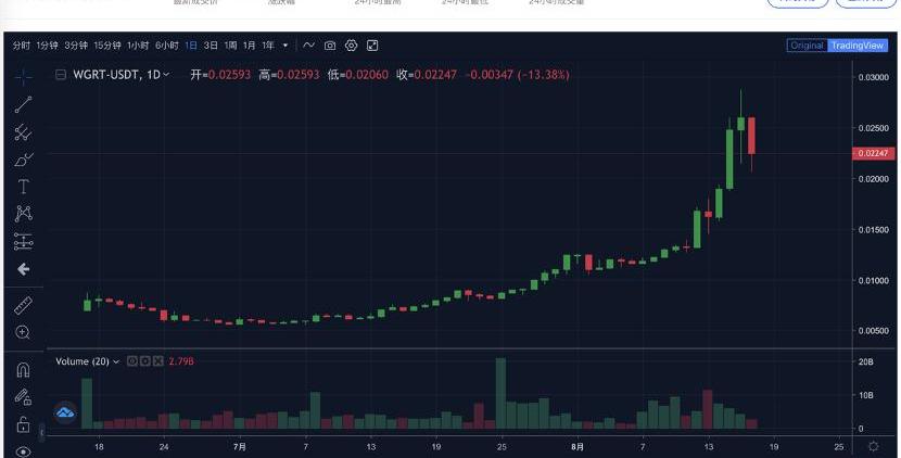 7月14日,WGRT啟動攀爬,此后的半個多月里,盧卡分別在0.01美元和0.015美元分兩次出完了WGRT,獲利空間在2-3倍,「結果還是賣早了。」8月16日,WGRT登頂上線OKEx以來的最高點0.028美元,較0.003美元的IEO認購價漲了958%。