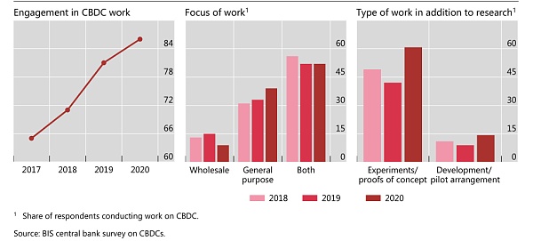 報告顯示,在2020年Covid-19大流行期間,關于CBDC的研究仍在迅速進行。參與調查的絕大多數中央銀行(占86%)正在積極研究CBDC的利弊。總體而言,各國正進入CBDC研究的更高級階段,并逐步向試點推進。從全球范圍來看,各國對CBDC的興趣受到國內實際情況的影響,數據顯示:在新興市場和發展中國家,中央銀行研究CBDC的動機相對較強。
