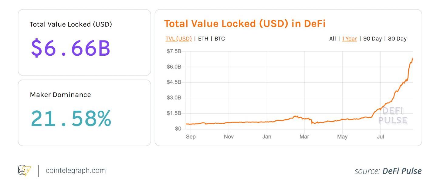 當市場的增長速度與DeFi市場一樣快時,市場可能難以保持平衡。當被問及DeFi是否正在鼓吹泡沫時,FrostBrownTodd?有限責任公司的律師JohnWagster告訴Cointelegraph:“DeFi鎖定的總價值從5月份的大約10億美元迅速增加到今天的60億美元,當然這可以被視為一個市場過熱的跡象。”但是,他還表示:“收益耕作的真正創新概念來自于聰明的工程,這些工程似乎吸引了尋找新機會的市場參與者。”