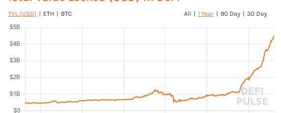 下圖是近一年來DeFi中鎖定的資產情況,可以看到,自2019年4月起,DeFi的資產規模開始穩步上漲,2020年5月左右資產規模呈加速上漲狀態,當前鎖定在DeFi中的總資產更是達到46.3億美金。
