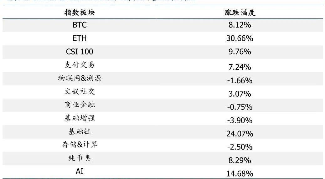 從細分板塊來看,基礎鏈、AI優于ChainextCSI100平均水平,為24.07%、14.68%;支付交易、物聯網&溯源、文娛社交、商業金融、基礎增強、存儲&計算、純幣類表現遜于ChainextCSI100平均水平,為7.24%、-1.66%、3.07%、-0.75%、-3.90%、-2.50%、8.29%。