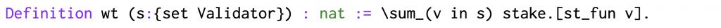 驗證者和團體。驗證者被抽象地表示為一個有限型的成員,寫為?Validator:finType?。每個驗證者都有一份保證金;這一事實我們建模成一個未解釋的函數?stake:{fmapValidator->nat},保存驗證者與其保證金數量的映射。此外,給定一個驗證者集合,其權重?wt?定義為該集合中所有驗證者保證金數量的總和:
