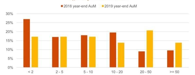 例如,如下圖所示,2018年加密對沖基金的績效中值為-46%。然而,納入今年報告的基金2019年年終績效中值為74%。這似乎也表明,前一年表現明顯不佳的基金不得不關閉。這一點在考慮AuM值很小的加密對沖基金時尤其重要,因為它們的平均管理費不足以維持盈虧平衡,除非收取高額績效費。