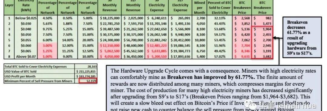 下面的分析顯示了以各種電價運營的礦工的利潤率壓縮所帶來的拋壓,一旦無利可圖的礦工關閉,賣壓隨之而來的緩解。我們提供了一種基于博弈論的模擬,它說明了各種情況下礦工的行為和決策。這些不是比特幣價格目標,而是當比特幣在減半前后處于特定價格水平時對采礦網絡的影響的說明。對于此模擬,“礦工層”內的所有礦工均使用單一的平均kWh費率。這種簡化合并了在每個比特幣盈虧平衡價格閾值“關閉”的采礦設備的數量。當礦工關閉時,這會形成瀑布,從而擴大了隨后的網絡難度和幸存礦工盈利能力的調整幅度。基于這些假設,此模型創建了一個“步驟圖”,這是一個概念化現實的有用說明,但更平滑,更線性的更改將更好地反映實際應用。為了保持一致,此分析提出以下聲明:·BitmanS17代表下一代采礦設備,而BitmainS9代表老式采礦設備。目前,下一代哈希與老一代哈希的百分比分別占網絡哈希總數的61.38%和38.63%。·?層中每個礦工的電費是統一的,并且基于層中所有礦工的平均kWh費率。因此,在此分析中,Layer中每個礦工的收支平衡成本均相等,并且在違反該價格時全部關閉。