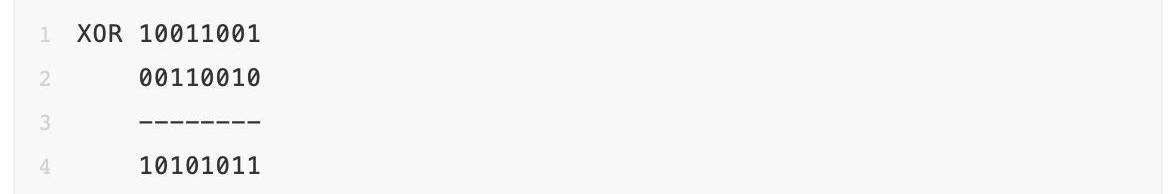 Kademlia使用XOR作為距離函數。XOR函數的特點在于,只有當輸入不同時,輸出才為true。下面是用二進制標識符表示的例子。