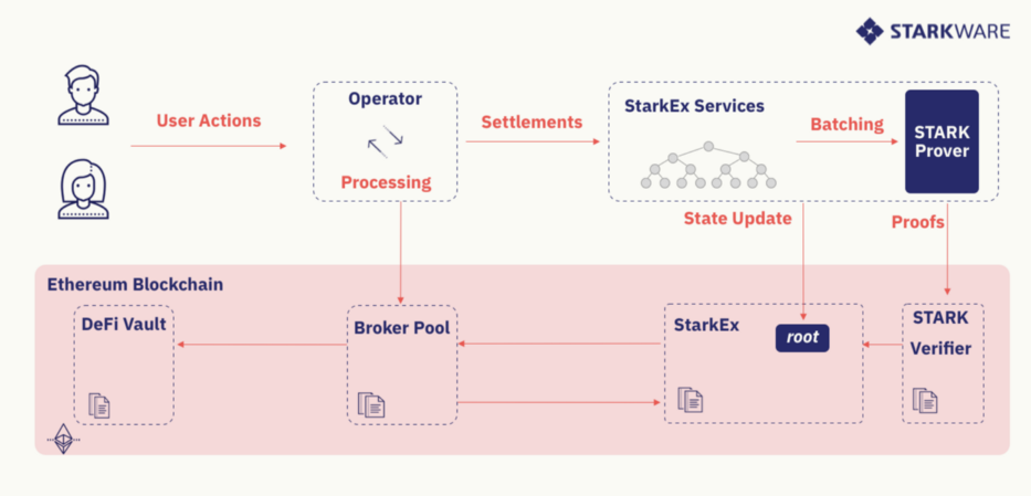 Broker池:一種新的鏈上智能合約,用于協調StarkEx合約的需求,管理池中的所有權并代表其與DeFi進行交易。